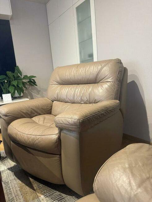 Do sprzedania skórzana kanapa i dwa fotele z funkcją relaks. W jednym fotelu widoczne niewielkie pęknięcie skóry. Kanapa ...